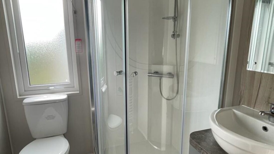 En-suite with quad shower enclosure with thermostatic shower, dual flush WC and wash basin