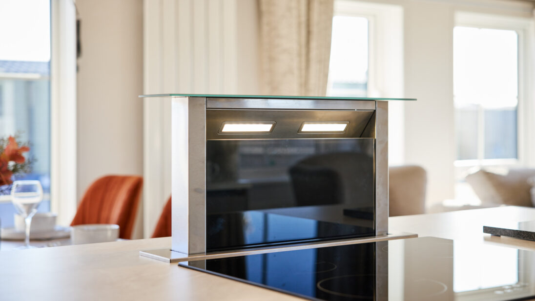 Premium appliance set including: Instant hot water tap, integrated dishwasher, induction hob to kitchen island with extraction through the floor, integrated high level oven, integrated 70/30 fridge freezer